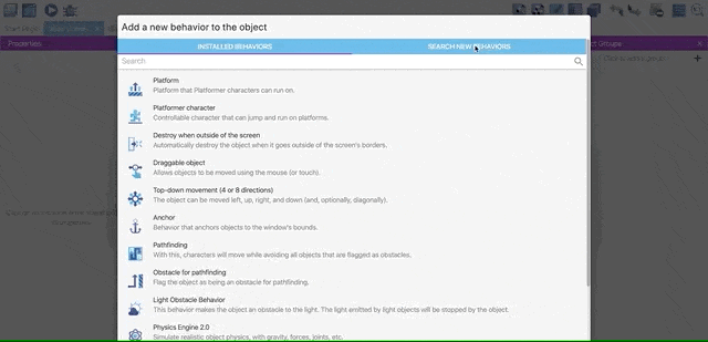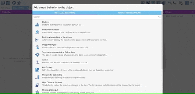 In this chapter, we will learn how to use Behaviours in our game. You can read the Behaviors page to learn more about them. Behaviors add extra capabilities to objects. All objects can have one or more behaviors attached to it.